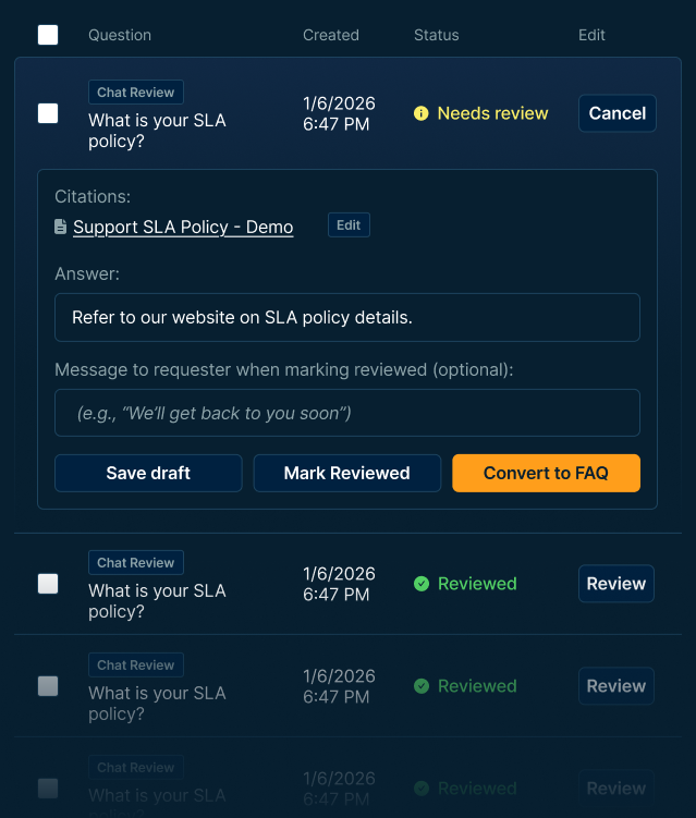 No. It replaces the repetitive part of their work, not the people. Your team stays in control, reviewing and approving every answer before it goes live. They get their time back for work that actually matters.