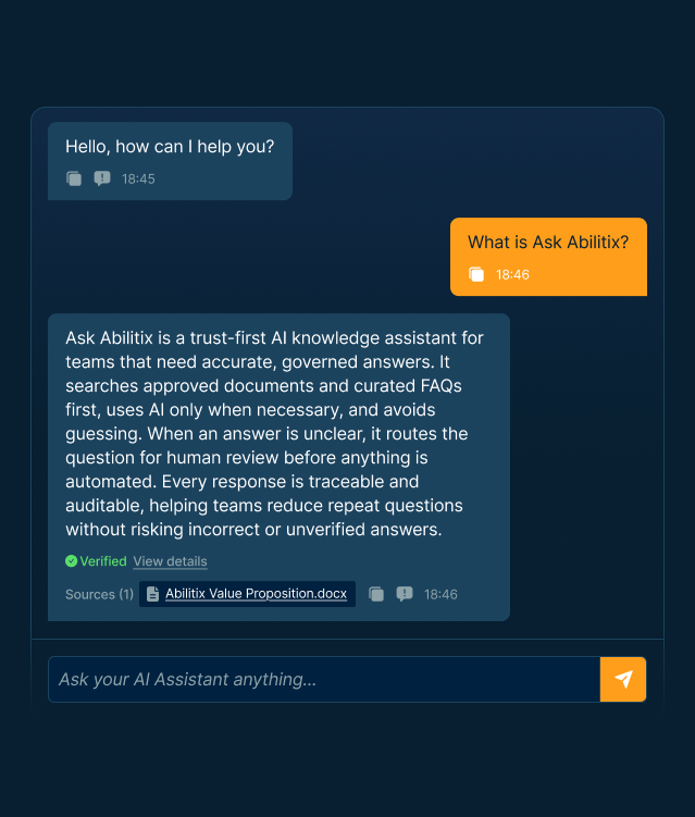 We built Ask Abilitix around one principle: your team stays in control. Every feature exists to keep humans in the loop, your data protected, and your options open.